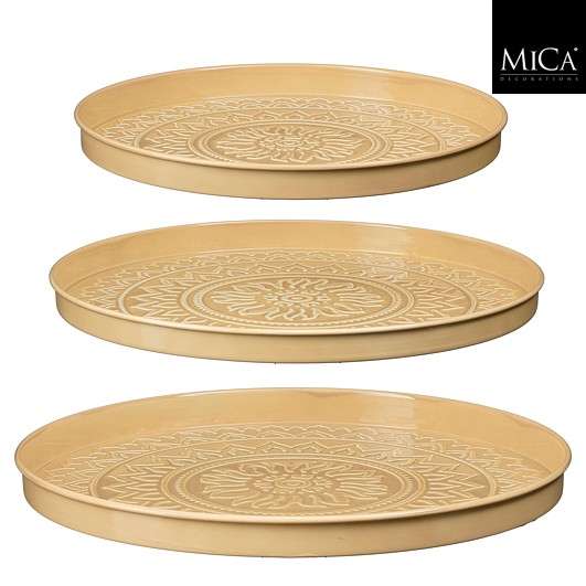Bandeja de metal lacada en beige. Con dibujo en relieve. Medida 35cm de diámetro x 2,5cm de altura