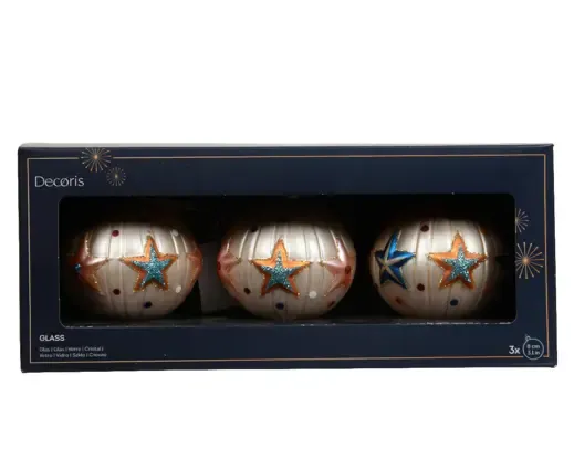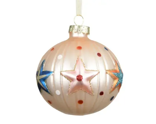 Bola navidad de cristal de color perla con estrellas de colores. Medida 8cm de diámetro. 1 unidad