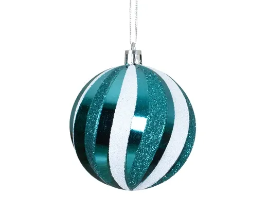 Bola navidad plástica con rayas color blanco y azulfolk. Diámetro 8cm