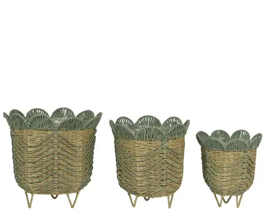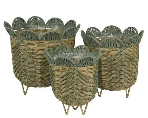 Cesta con patas, hecha de cuerda de papel. Con plástico interior. Válida uso interior. Medida 34,5cm de altura x 29cm de diámetro