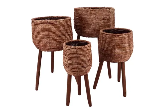 Cesta hecha de alga seca marrón oscura con patas de madera. Forrada en el interior. Medida 60cm altura x 32cm ancho