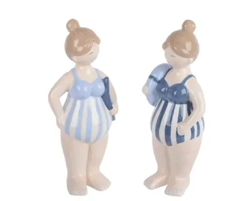 Chica bañador azul hecho en cerámica. Dos modelos disponibles. Preguntar disponibilidad en caso de modelo en concreto. Medida 23,5cm de altura x 10cm de ancho x 7,5cm de largo