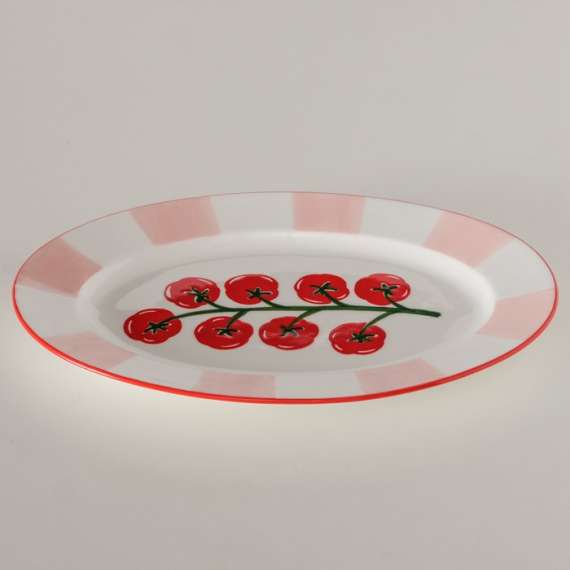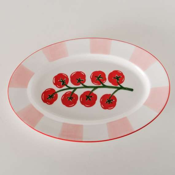 La bandeja para servir Tomate está elaborada en porcelana vidriada y trabajada a mano. Presenta un diseño multicolor a rayas en rosa claro, rojo y blanco, con acabado brillante y forma ovalada. Mide 30, 30 cm de largo, 20, 20 cm de ancho y 3, 00 cm de alto. Es apta para microondas, lavavajillas y horno hasta 250°C.