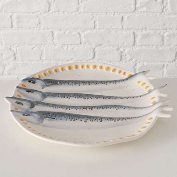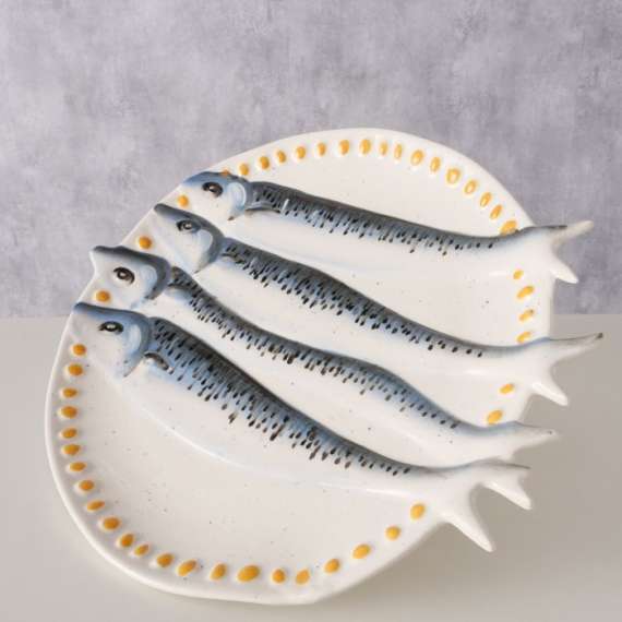 El plato Sardino, elaborado a mano en gres, destaca por su forma redonda y diseño multicolor en azul y blanco. El esmaltado con acabado brillante resalta su aspecto de calidad, mientras el motivo de pez aporta distinción. Apto para lavavajillas y microondas. Medidas: largo 29, 50 cm, ancho 26, 50 cm.