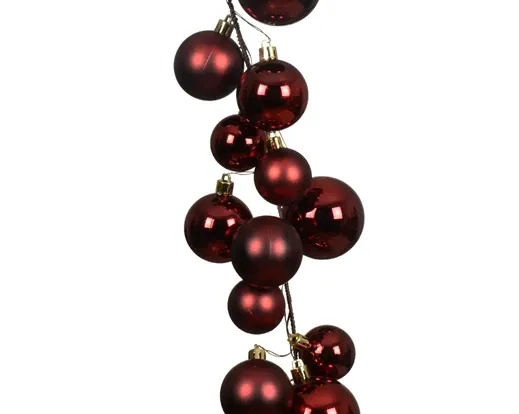 Guirnalda de navidad hecha de bolas de distintos tamaños. Color rojo navideño. Medida 180x10x10cm. Incluye bolas mate, brillo plásticas