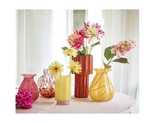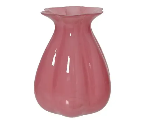 Jarrón de cristal con cuello forma de flor en color rosa. Medida 20cm altura x 15cm de ancho