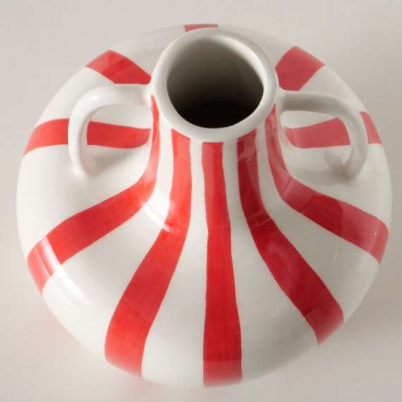 Jarrón de cerámica blanco con rayas rojas modelo Londi. Medida 17cm alto x 15cm de diámetro