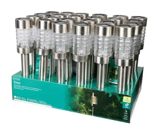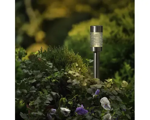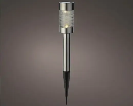 Lámpara solar para jardín. La estaca hecha de acero inoxidable, lámpara de plástico y cristal. Medida 28,8cm altura x 6,20cm de ancho. Luz blanco cálido