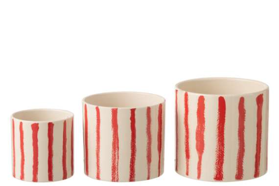 Maceta de cerámica con rayas verticales en rojo. Medida 14cm altura x 15,5 cm de ancho