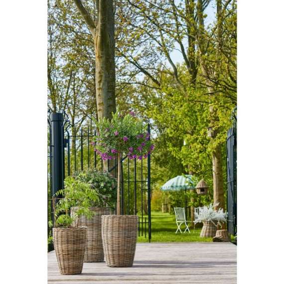 Maceta alta hacha de mimbre. Modelo Marcia. Válida para uso exterior. Forrada en el interior. Resistente a rayos UVA. Medida 70cm altura x 48cm ancho