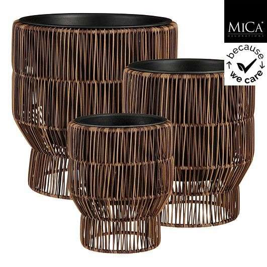 Maceta modelo Peta. Redonda de mimbre sintético con cubeta interior. Válida para uso exterior. Medida 27cm altura x 22cm de ancho