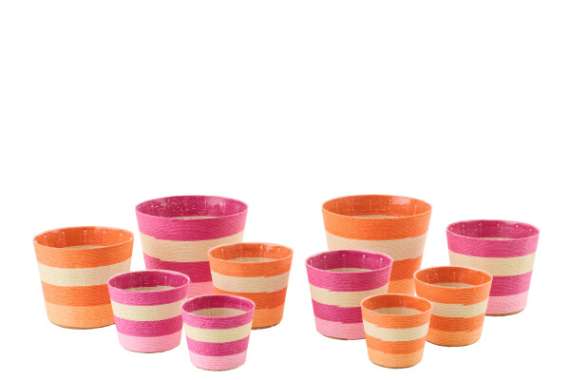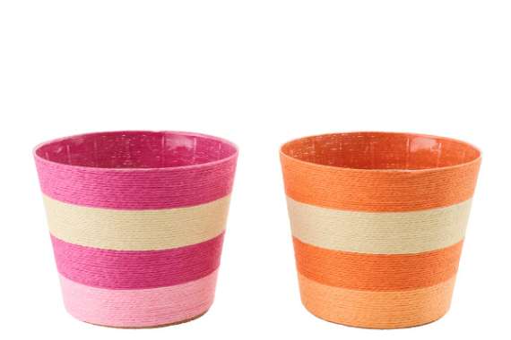 Maceta hecha con cuerda de papel de color rosa o naranja. Medida 17cm altura