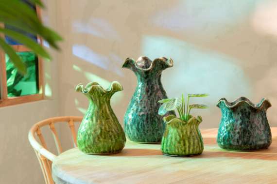 Maceta Ronny irregular de arcilla verde. Medida 13,5cm de altura