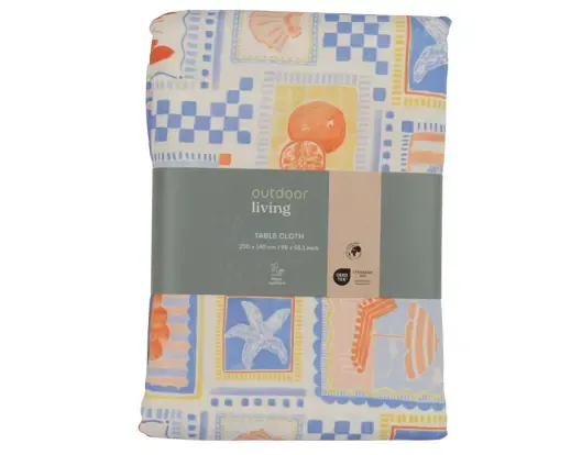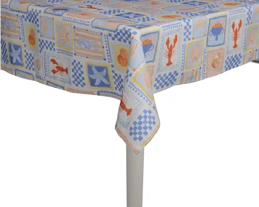 Mantel marinero con langosta de poliéster. Medida 250cm de largo x 140cm de ancho. Válido de uso exterior