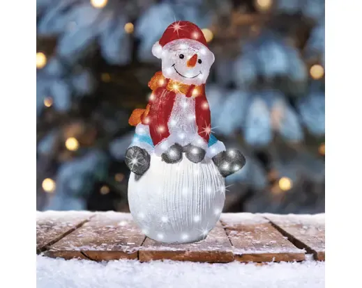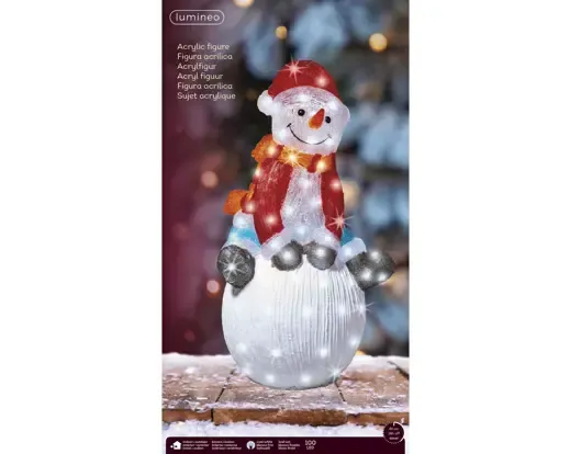 Muñeco de nieve encima de bola de nieve. Luz blanco fría. Válido para uso exterior. Medida 70,5cm altura x 40,5cm ancho x 33cm largo