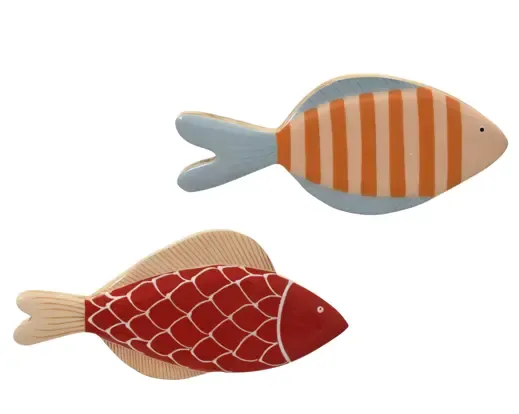 Pez hecho de madera de mango para colgar en la pared. Finalizado con esmaltado. Medida 2,5cm altura x 12cm de ancho x 25,5cm de largo. Dos modelos a escoger. Consultar disponibilidad en caso de modelo en concreto