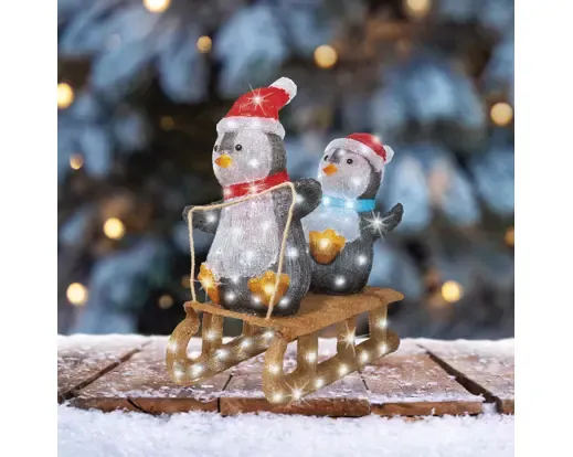 Trineo de pingüinos en acrílico. Válido para uso exterior. Luz blanco frío. Medida 56,5 de altura x 61,5cm de largo x 31cm ancho