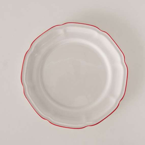 Plato de cerámica blanco con borde rojo. Modelo Hedda. Apto para microondas y lavavajillas. Diámetro 21cm