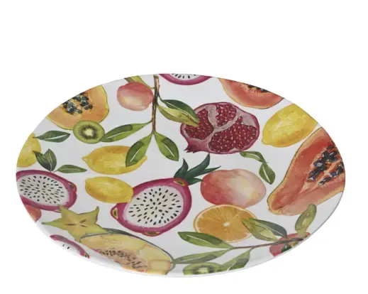 Plato de melamina de frutas tropicales. Medida 26,5cm de diámetro