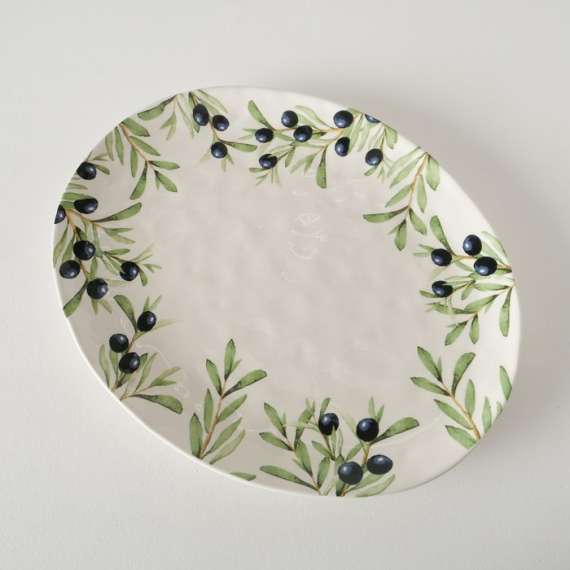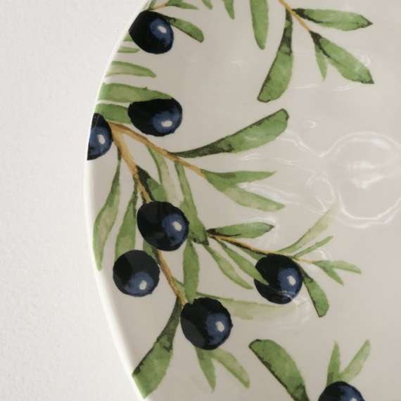 Fuente de cerámica con olivas. Medida 39cm de largo x 31cm de ancho x 3cm de altura