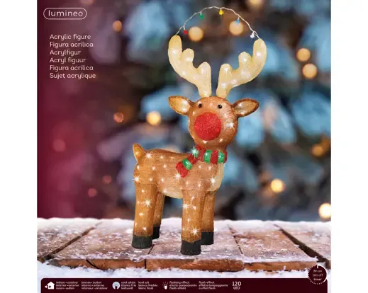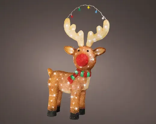 Reno acrílico de colores. Luz blanco fría y efecto flash. 120 luces. Incluye transformador. Válido para uso exterior