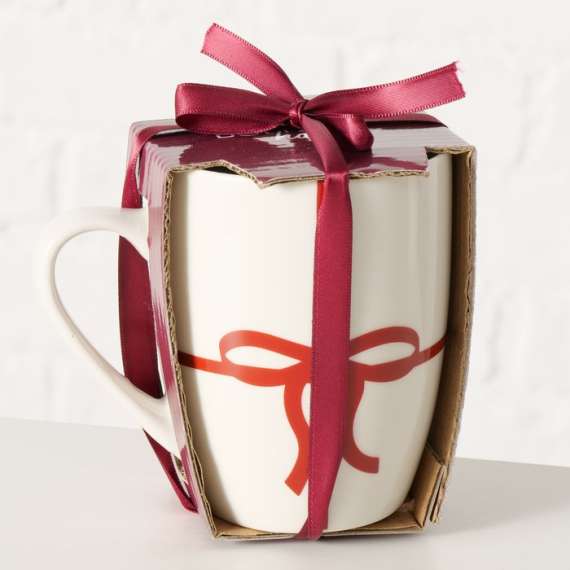 Taza de cerámica con lazo de color rojo. Medida 10,5cm altura x 8,5cm diámetro. 350ml de capacidad