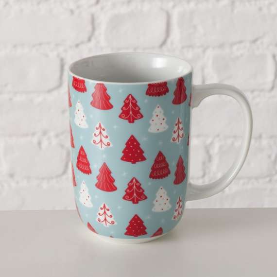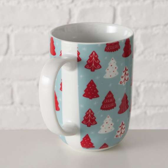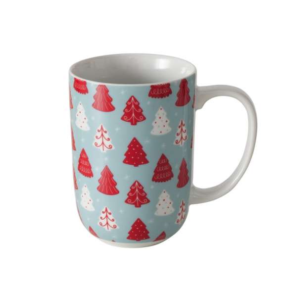 Taza de desayuno modelo Tomke. Dibujo árboles de navidad en tonos azul y rojo. Medida 13x12,5cm. Capacidad para 500ml
