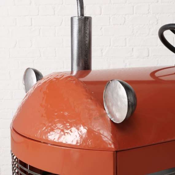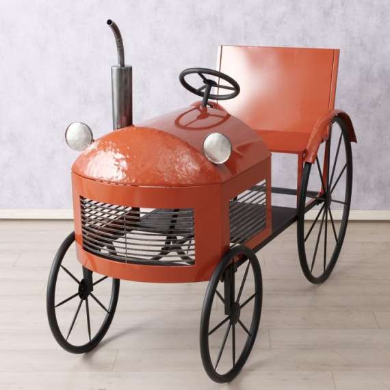 Tractor de metal color naranja-ocre. Válido para uso interior.